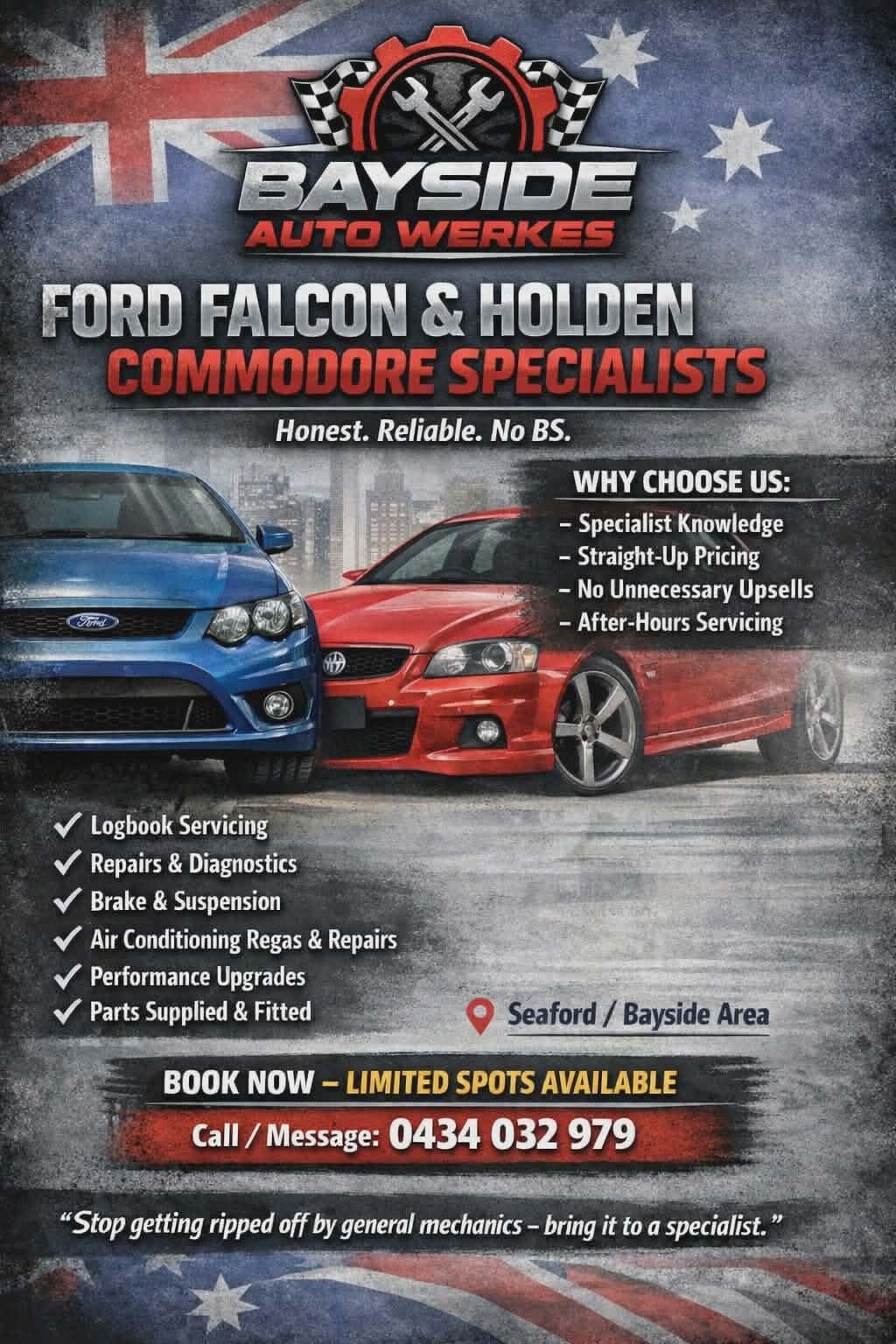 Welcome to Bayside Auto Werkes, your trusted local mechanic in Seaford. We're dedicated to providing honest and high-quality car services, ensuring your vehicle runs safely and smoothly. Servicing all makes and models. Falcon & Commodore Specialists. Discover why countless customers choose us for their automotive needs.
